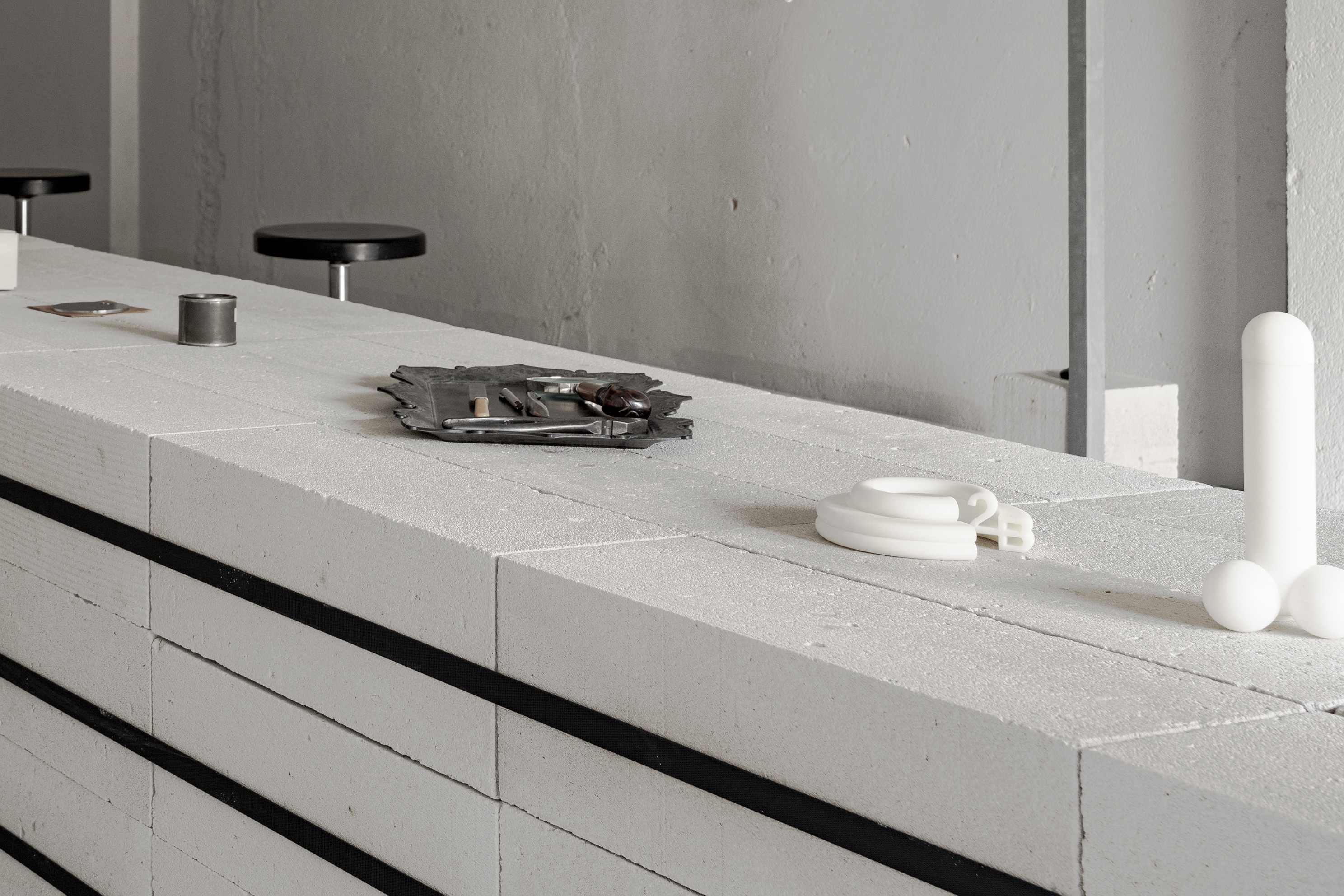 The 240 bricks are bound together by black binding straps, creating a sense of unity that diminishes the individuality of each brick, similar to Ilse Aichinger's description of metal bent into a loop. The long black binding straps are "offering resistance only until it is soldered. In this moment of most extreme resistance, it attains its most relaxed, most natural form, and in the greatest tension, its greatest serenity. And only then. "